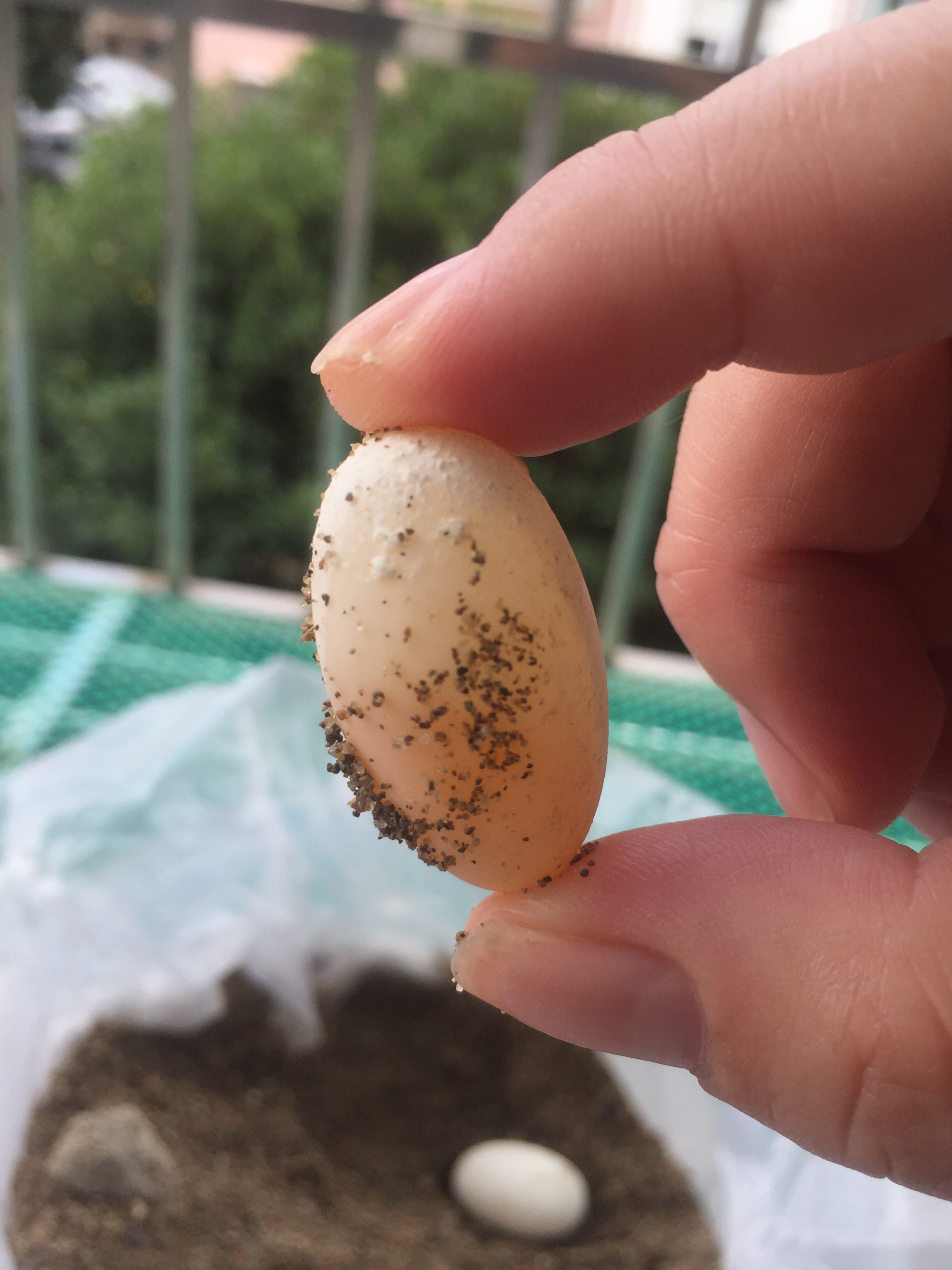 几天后,我扒开沙子两枚受精蛋没有出现授精斑和血丝,而试蛋已经臭了,我把臭试蛋扔了,把两枚受精蛋放在了沙子上。我每天观察,发现几乎没有什么变化,几天后,我发现有一枚也已经臭掉了。我又伤心,又百思不得其解,只好去查百度,百度告诉我乌龟蛋的最佳孵化温度是22℃到34℃左右,但是,我家的乌龟蛋是天天放在外面的,被太阳晒着。白天温度至少有34-35度。晚上有30度左右,乌龟蛋都被热死了,而且湿度也太大了。