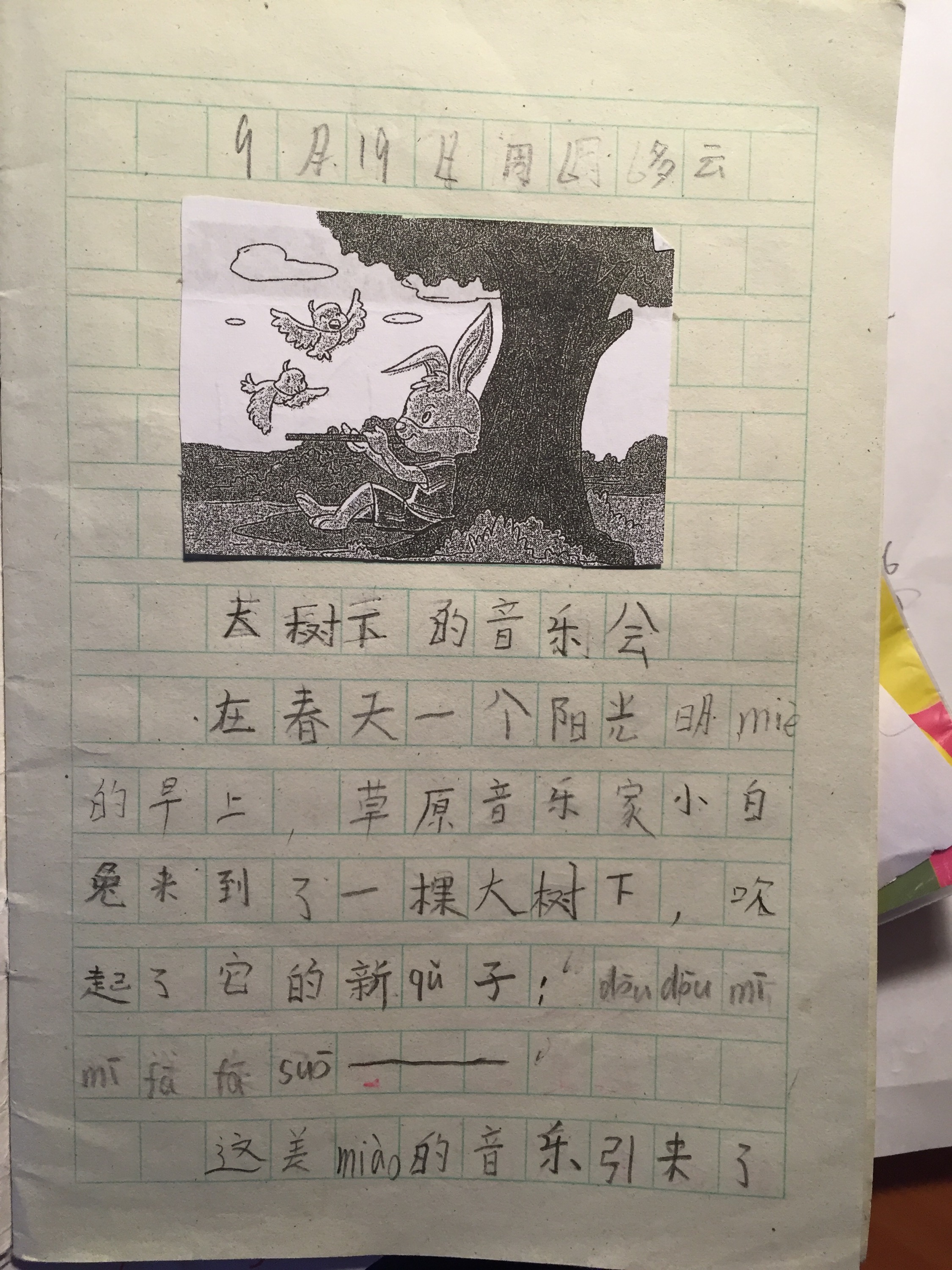 大树下的音乐会 Posted on 2015年11月26日2015年11月26日希希写话 在春天一个阳光明媚的早上,草原音乐家小白兔来到了一颗大树下,吹起了它的新曲子:‘dou dou mi mi fa fa suo ……’. 这美丽的音乐引来了两只小鸟,它们随着音乐的高低叫着、飞着。它们好像那音符,时高时低。 大叔爷爷也随着音乐的节拍摇着树叶:沙沙沙,沙沙沙。 音乐会从早上开到傍晚,看着这一切,连白云也不想走了,连太阳也不想下山了。 Author: luchenyi All posts